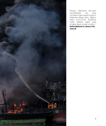 Petugas kebakaran berusaha memadamkan api yang membakar kapal-kapal nelayan di Pelabuhan Muara Baru, Jakarta, Sabtu (23/2/2019). Sedikitnya sudah belasan kapal yang terbakar dalam insiden tersebut. Hafidz Mubarak A | Antara Foto Juara III 8